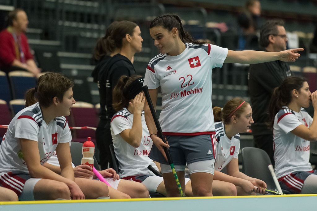 Ladina Sgier (26, Schweiz), Sonja Putzi (13, Schweiz) und Seraina Ulber (22, Schweiz) in der Diskussion, waehrend dem Guppenspiel Schweiz gegen Polen, Unihockey Weltmeisterschaft der Damen 2015, 4. Dezember 2015, Tampere Areena, in Tampere, Finnland (imagepower.ch/Fabian Trees)