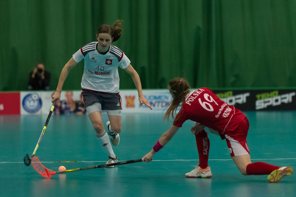 Priska von Rickenbach (48, Schweiz) gegen Justyna Krzywak (69, Polen), waehrend dem Guppenspiel Schweiz gegen Polen, Unihockey Weltmeisterschaft der Damen 2015, 4. Dezember 2015, Tampere Areena, in Tampere, Finnland (imagepower.ch/Fabian Trees)