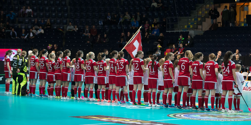Waehrend der Hymne, Gruppenspiel Schweiz gegen Finnland, Unihockey Weltmeisterschaft der Damen 2015, 5. Dezember 2015, Hakametsae Eishalle, in Tampere, Finnland (www.imagepower.ch / Fabian Trees)