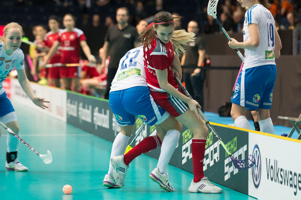 Nina Baertschi (rechts, Schweiz) gegen Ella Alanko (links, Finnland), waehrend dem Guppenspiel Schweiz gegen Finnland, Unihockey Weltmeisterschaft der Damen 2015, 5. Dezember 2015, Hakametsae Eishalle, in Tampere, Finnland (swiss unihockey/Fabian Trees)