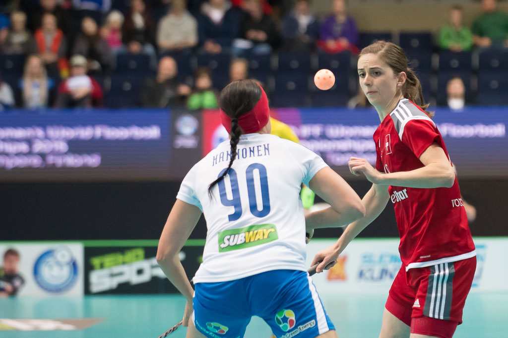 Marianne Hannonen (90, Finnland) gegen Priska von Rickenbach (48, Schweiz) , Gruppenspiel Schweiz gegen Finnland, Unihockey Weltmeisterschaft der Damen 2015, 5. Dezember 2015, Hakametsae Eishalle, in Tampere, Finnland (www.imagepower.ch / Fabian Trees)