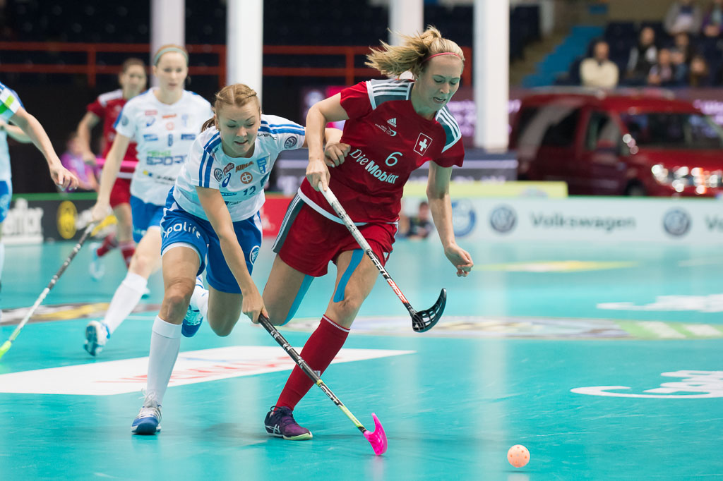 Mia Karjalainen (links, Finnland) gegen Michelle Wiki (rechts, Schweiz), waehrend dem Guppenspiel Schweiz gegen Finnland, Unihockey Weltmeisterschaft der Damen 2015, 5. Dezember 2015, Hakametsae Eishalle, in Tampere, Finnland (swiss unihockey/Fabian Trees)