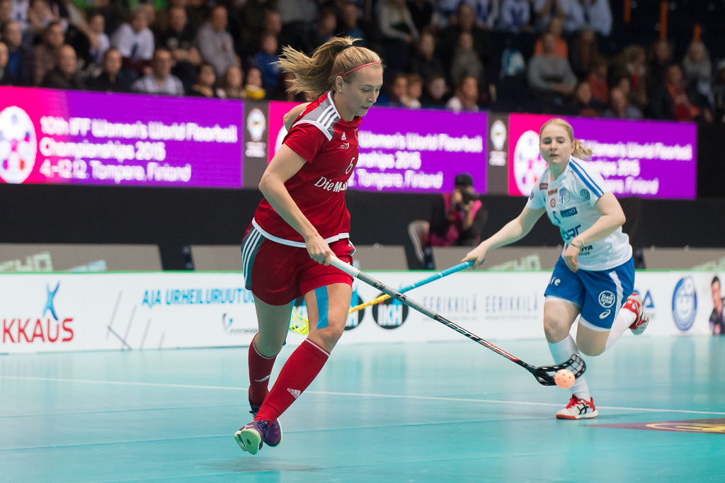 Michelle Wiki (6, Schweiz) , Gruppenspiel Schweiz gegen Finnland, Unihockey Weltmeisterschaft der Damen 2015, 5. Dezember 2015, Hakametsae Eishalle, in Tampere, Finnland (www.imagepower.ch / Fabian Trees)