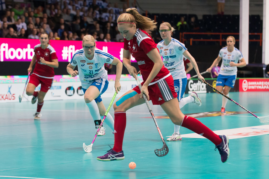Michelle Wiki (6, Schweiz) , Gruppenspiel Schweiz gegen Finnland, Unihockey Weltmeisterschaft der Damen 2015, 5. Dezember 2015, Hakametsae Eishalle, in Tampere, Finnland (www.imagepower.ch / Fabian Trees)