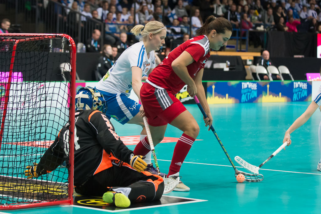 Seraina Ulber (22, Schweiz) gegen Kristiina Kauppila (14, Finnland) und Jonna Maekelae (84, Finnland), Gruppenspiel Schweiz gegen Finnland, Unihockey Weltmeisterschaft der Damen 2015, 5. Dezember 2015, Hakametsae Eishalle, in Tampere, Finnland (www.imagepower.ch / Fabian Trees)