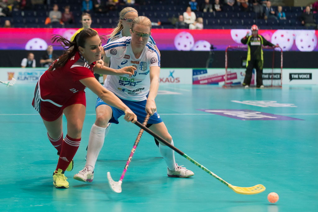 Seraina Ulber (links, Schweiz) gegen Anne Suomalainen (rechts, Finnland), waehrend dem Guppenspiel Schweiz gegen Finnland, Unihockey Weltmeisterschaft der Damen 2015, 5. Dezember 2015, Hakametsae Eishalle, in Tampere, Finnland (swiss unihockey/Fabian Trees)