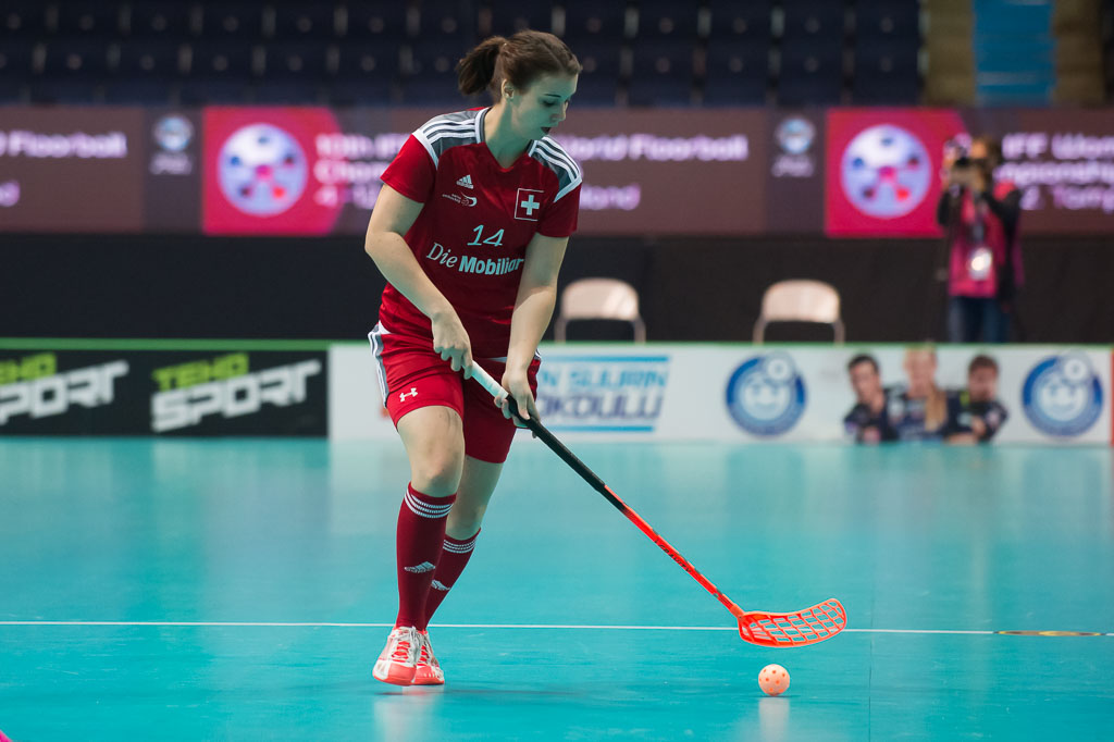 Corinne Haeubi (14, Schweiz), Gruppenspiel Schweiz gegen Norwegen, Unihockey Weltmeisterschaft der Damen 2015, 6. Dezember 2015, Hakametsae Eishalle, in Tampere, Finnland (www.imagepower.ch / Fabian Trees)