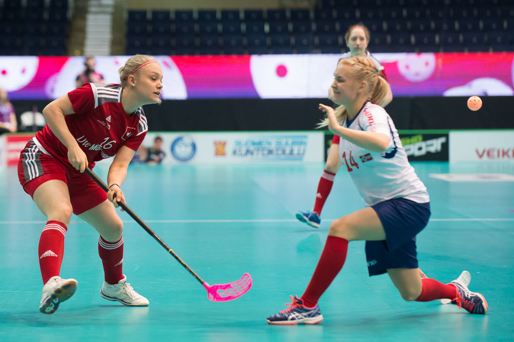 Celine Chalverat (links, Schweiz) gegen Hanne Hansen (rechts, Norwegen), waehrend dem Guppenspiel Schweiz gegen Finnland, Unihockey Weltmeisterschaft der Damen 2015, 6. Dezember 2015, Hakametsae Eishalle, in Tampere, Finnland (swiss unihockey/Fabian Trees)