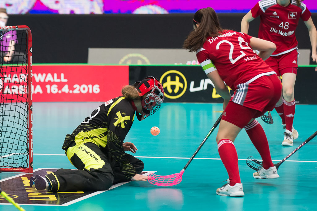 Helen Bircher (28, Schweiz) und Flurina Marti (24, Schweiz), Gruppenspiel Schweiz gegen Norwegen, Unihockey Weltmeisterschaft der Damen 2015, 6. Dezember 2015, Hakametsae Eishalle, in Tampere, Finnland (www.imagepower.ch / Fabian Trees)