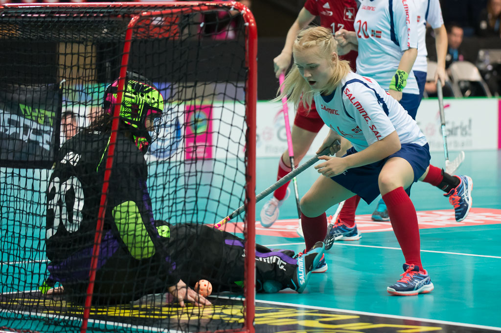 Charlotte Holt (30, Norwegen) und Hanne Hansen (14, Norwegen) retten, Gruppenspiel Schweiz gegen Norwegen, Unihockey Weltmeisterschaft der Damen 2015, 6. Dezember 2015, Hakametsae Eishalle, in Tampere, Finnland (www.imagepower.ch / Fabian Trees)