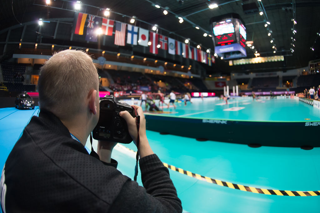 Erwin Keller beim Gruppenspiel Schweiz gegen Norwegen, Unihockey Weltmeisterschaft der Damen 2015, 6. Dezember 2015, Hakametsae Eishalle, in Tampere, Finnland (www.imagepower.ch / Fabian Trees)