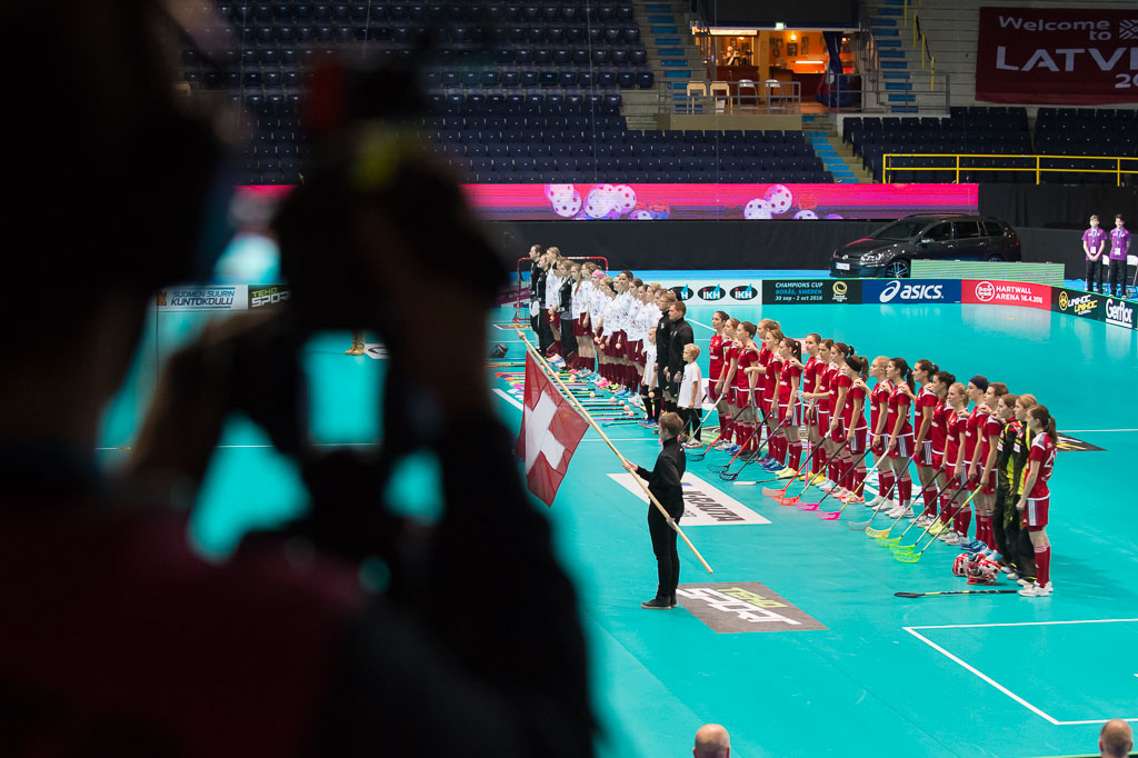 Waehrend der Hymne, Viertelfinal Schweiz gegen Lettland, Unihockey Weltmeisterschaft der Damen 2015, 9. Dezember 2015, Hakametsae Eishalle, in Tampere, Finnland (www.imagepower.ch / Fabian Trees)