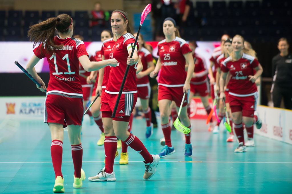 Nina Baertschi (11, Schweiz) laesst sich feiern, Viertelfinal Schweiz gegen Lettland, Unihockey Weltmeisterschaft der Damen 2015, 9. Dezember 2015, Hakametsae Eishalle, in Tampere, Finnland (www.imagepower.ch / Fabian Trees)