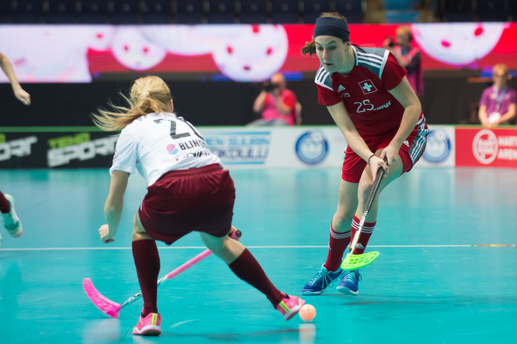 Katrin Zwinggi (25, Schweiz) gegen Gundega Vancane (20, Lettland), Viertelfinal Schweiz gegen Lettland, Unihockey Weltmeisterschaft der Damen 2015, 9. Dezember 2015, Hakametsae Eishalle, in Tampere, Finnland (www.imagepower.ch / Fabian Trees)