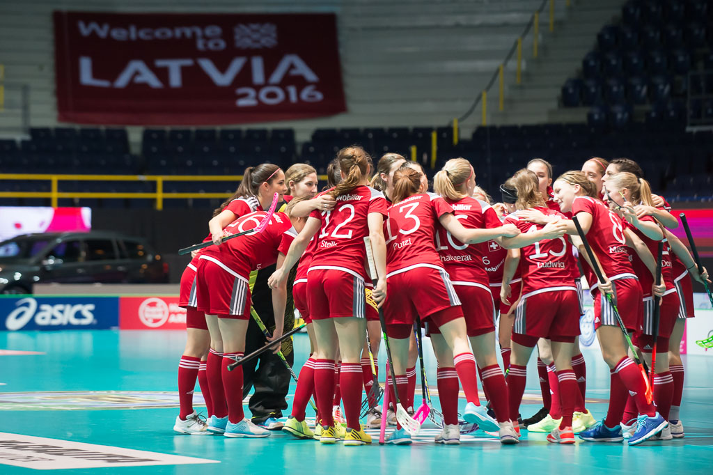 Die Schweizerinnen jubeln, Viertelfinal Schweiz gegen Lettland, Unihockey Weltmeisterschaft der Damen 2015, 9. Dezember 2015, Hakametsae Eishalle, in Tampere, Finnland (www.imagepower.ch / Fabian Trees)