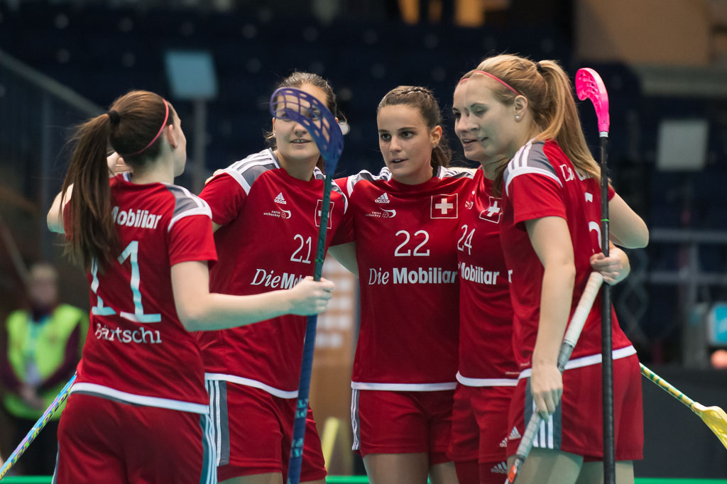 Nina Baertschi (Schweiz), Corin Ruettimann (Schweiz), Seraina Ulber (Schweiz), Flurina Marti (Schweiz) und Michelle Wiki (von links, Schweiz) jubeln, waehrend dem Viertelfinal Schweiz gegen Lettland, Unihockey Weltmeisterschaft der Damen 2015, 9. Dezember 2015, Hakametsae Eishalle, in Tampere, Finnland (swiss unihockey/Fabian Trees)