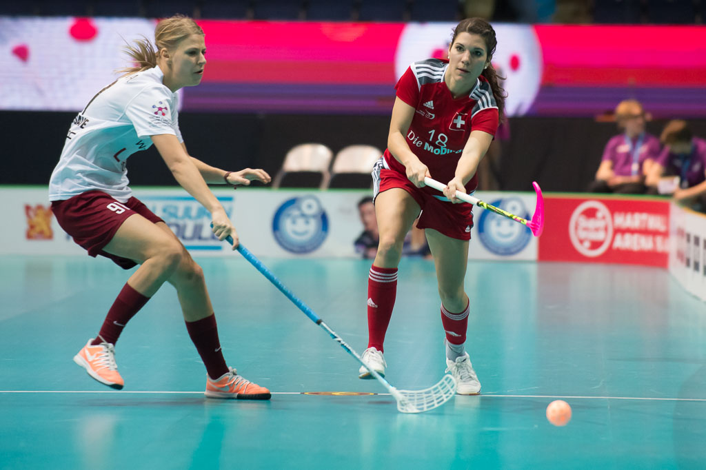 Margrit Scheidegger (18, Schweiz) gegen Liga Garklava (91, Lettland), Viertelfinal Schweiz gegen Lettland, Unihockey Weltmeisterschaft der Damen 2015, 9. Dezember 2015, Hakametsae Eishalle, in Tampere, Finnland (www.imagepower.ch / Fabian Trees)