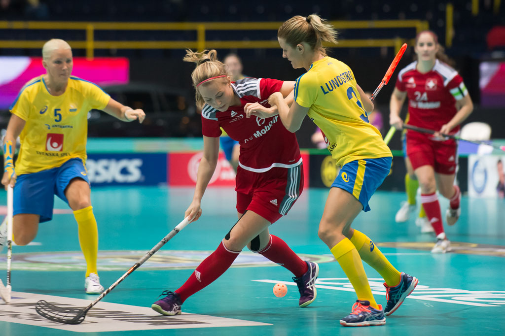 Michelle Wiki (6, Schweiz) gegen Linn Lundstrom (3, Schweden), Halbfinal Schweden gegen Schweiz, Unihockey Weltmeisterschaft der Damen 2015, 11. Dezember 2015, Hakametsae Eishalle, in Tampere, Finnland (www.imagepower.ch / Fabian Trees)