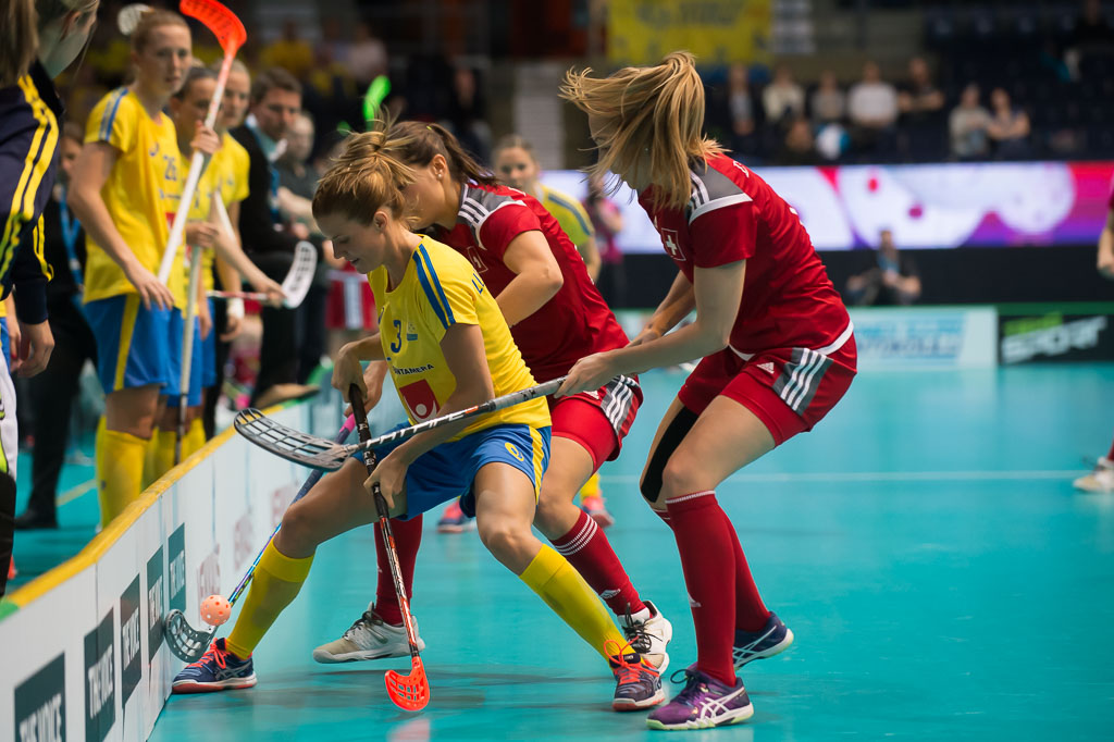 Linn Lundstrom (3, Schweden) vor Corin Ruettimann (21, Schweiz) und Michelle Wiki (6, Schweiz), Halbfinal Schweden gegen Schweiz, Unihockey Weltmeisterschaft der Damen 2015, 11. Dezember 2015, Hakametsae Eishalle, in Tampere, Finnland (www.imagepower.ch / Fabian Trees)