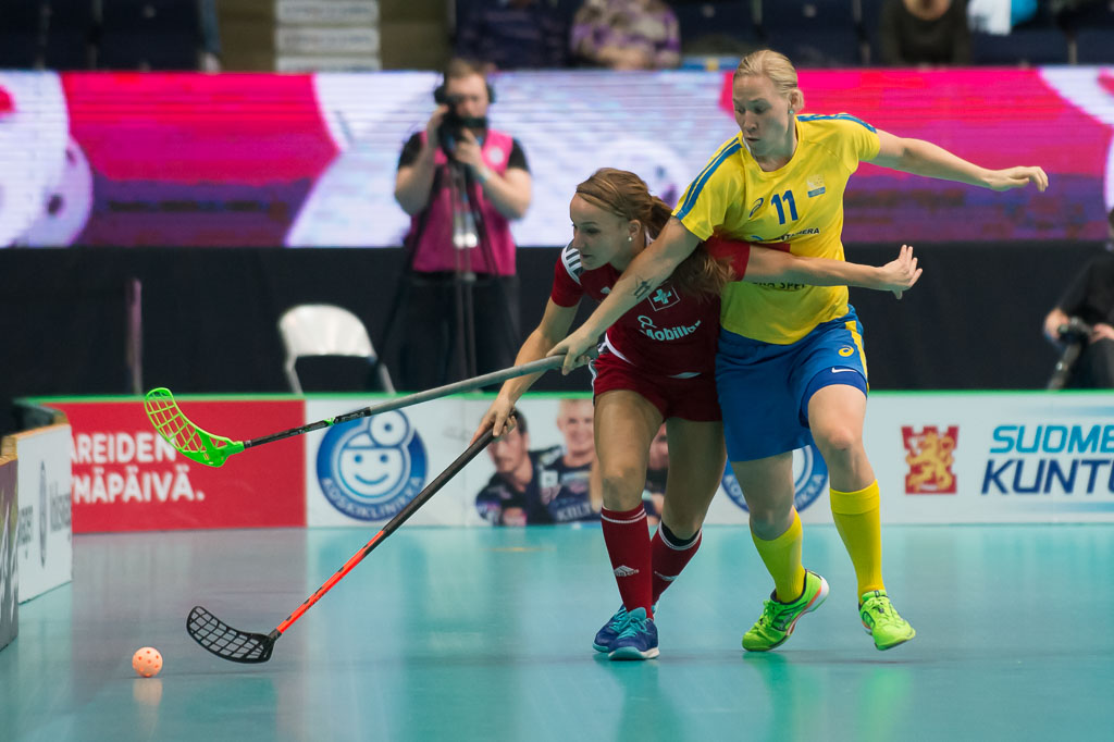 Brigitte Mischler (8, Schweiz) gegen Louise Wickstroem (11, Schweden), Halbfinal Schweden gegen Schweiz, Unihockey Weltmeisterschaft der Damen 2015, 11. Dezember 2015, Hakametsae Eishalle, in Tampere, Finnland (www.imagepower.ch / Fabian Trees)