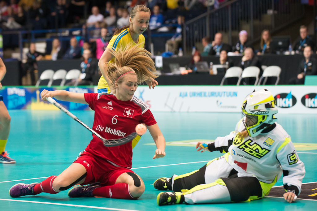 Michelle Wiki (links, Schweiz) gegen Sara Hjorting (rechts, Schweden), waehrend dem Halbfinal Schweden gegen Schweiz, Unihockey Weltmeisterschaft der Damen 2015, 11. Dezember 2015, Hakametsae Eishalle, in Tampere, Finnland (swiss unihockey/Fabian Trees)