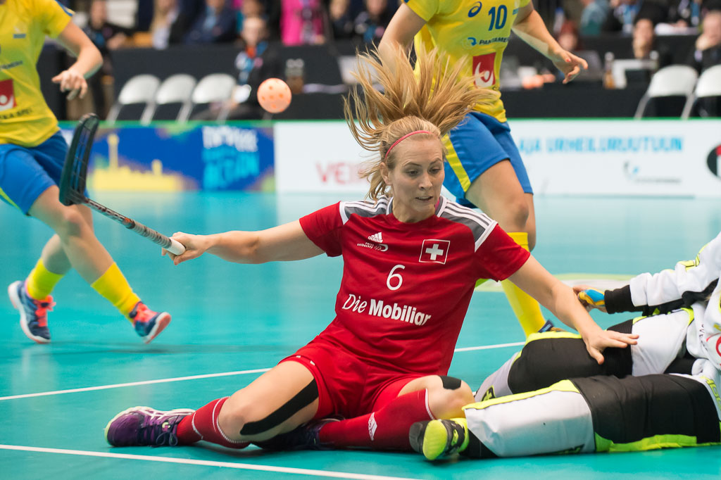 Michelle Wiki (6, Schweiz) vor Cornelia Fjellstedt (10, Schweden) gegen Sara Hjorting (1, Schweden), , Halbfinal Schweden gegen Schweiz, Unihockey Weltmeisterschaft der Damen 2015, 11. Dezember 2015, Hakametsae Eishalle, in Tampere, Finnland (www.imagepower.ch / Fabian Trees)