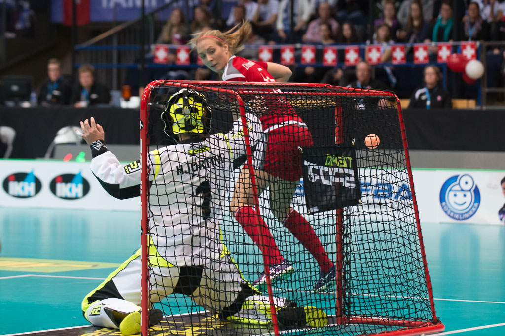 Michelle Wiki (6, Schweiz) gegen Sara Hjorting (1, Schweden), Halbfinal Schweden gegen Schweiz, Unihockey Weltmeisterschaft der Damen 2015, 11. Dezember 2015, Hakametsae Eishalle, in Tampere, Finnland (www.imagepower.ch / Fabian Trees)