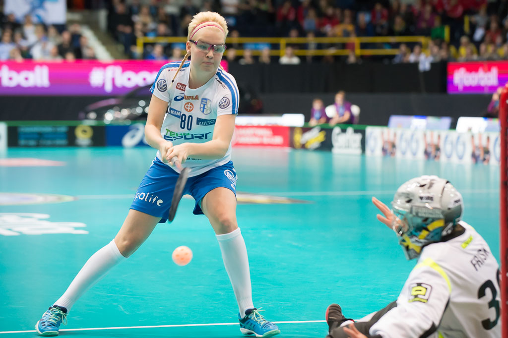 My Kippilae (80, Finnland) gegen Sara Hjorting (1, Schweden), Final Finnland gegen Schweden, Unihockey Weltmeisterschaft der Damen 2015, 13. Dezember 2015, Hakametsae Eishalle, in Tampere, Finnland (www.imagepower.ch / Fabian Trees)