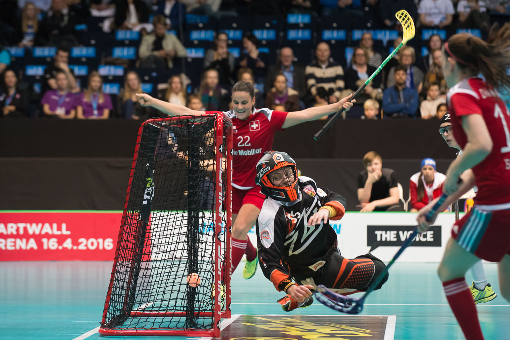Seraina Ulber (hinten, Schweiz) jubelt, Lenka Kubickova vorne, Tschechien) kommt zu spaet, waehrend dem Halbfinal Schweden gegen Schweiz, Unihockey Weltmeisterschaft der Damen 2015, 11. Dezember 2015, Hakametsae Eishalle, in Tampere, Finnland (swiss unihockey/Fabian Trees)