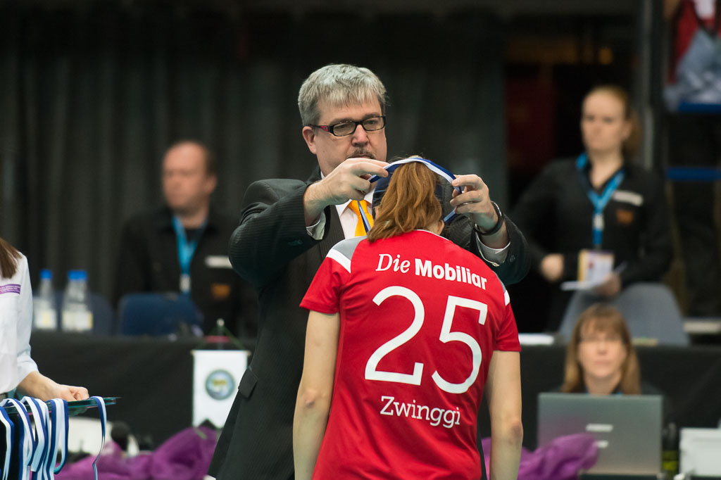 John Liljelund uebergibt Katrin Zwinggi (25, Schweiz) die Medaille. Bronzespiel Schweiz gegen Tschechien, Unihockey Weltmeisterschaft der Damen 2015, 13. Dezember 2015, Hakametsae Eishalle, in Tampere, Finnland (www.imagepower.ch / Fabian Trees)