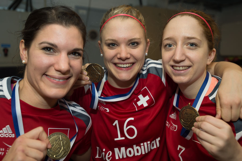 Margrit Scheidegger (18, Schweiz), Celine Chalverat (16, Schweiz) und Janine Wuethrich (3, Schweiz), Bronzespiel Schweiz gegen Tschechien, Unihockey Weltmeisterschaft der Damen 2015, 13. Dezember 2015, Hakametsae Eishalle, in Tampere, Finnland (www.imagepower.ch / Fabian Trees)