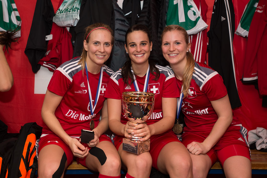 Michelle Wiki (6, Schweiz), Seraina Ulber (22, Schweiz) und Manuela Dominioni (23, Schweiz), Bronzespiel Schweiz gegen Tschechien, Unihockey Weltmeisterschaft der Damen 2015, 13. Dezember 2015, Hakametsae Eishalle, in Tampere, Finnland (www.imagepower.ch / Fabian Trees)