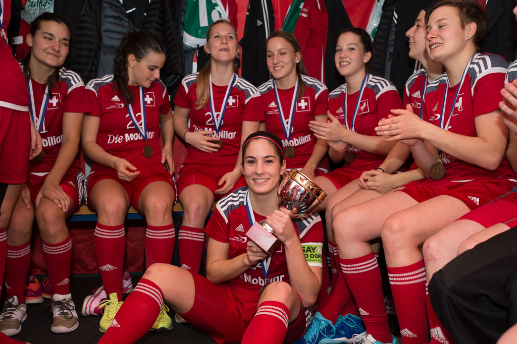 Flurina Marti (24, Schweiz) in der Mitte sowie Corin Ruettimann (21, Schweiz), Seraina Ulber (22, Schweiz) Manuela Dominioni (23, Schweiz) Brigitte Mischler (8, Schweiz) Lena Cina (4, Schweiz) Katrin Zwinggi (25, Schweiz) und Ladina Sgier (26, Schweiz), Bronzespiel Schweiz gegen Tschechien, Unihockey Weltmeisterschaft der Damen 2015, 13. Dezember 2015, Hakametsae Eishalle, in Tampere, Finnland (www.imagepower.ch / Fabian Trees)